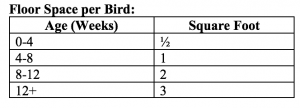 *A 10’ X 10’ brooder house is adequate until 8 weeks of age.